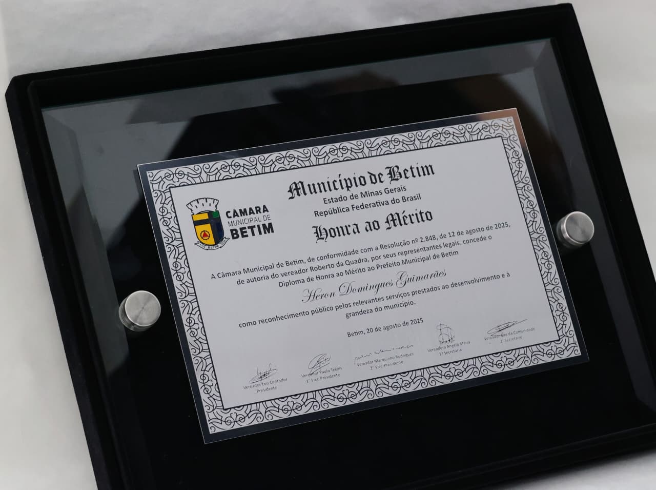 De autoria do vereador Roberto da Quadra, o título foi concedido a Heron Guimarães em agosto de 2025, em reconhecimento aos relevantes serviços prestados em favor do desenvolvimento de Betim.