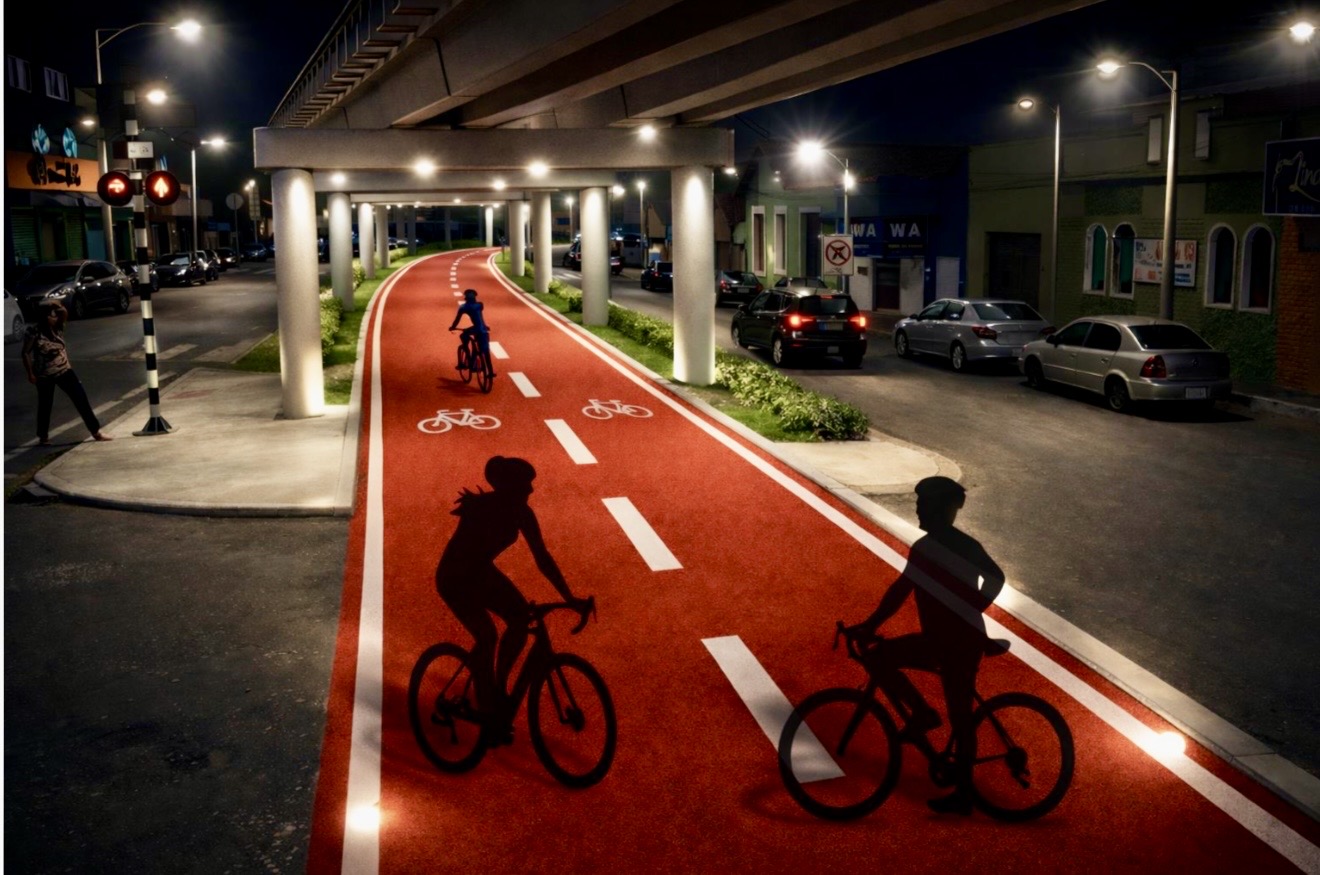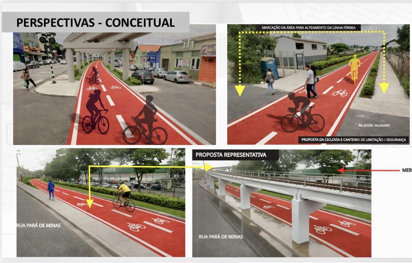 Nos trechos do Alterosa e do Centro, a solução apresentada prevê o alteamento contínuo da via férrea por meio de estruturas em concreto armado, criando uma área livre no nível inferior que será requalificada com parque linear, ciclofaixa, paisagismo, iluminação e mobiliário urbano. Também estão previstos serviços complementares, como drenagem, sinalização viária, calçadas acessíveis e tratamento urbanístico, além de adequações do greide em vias adjacentes do entorno.