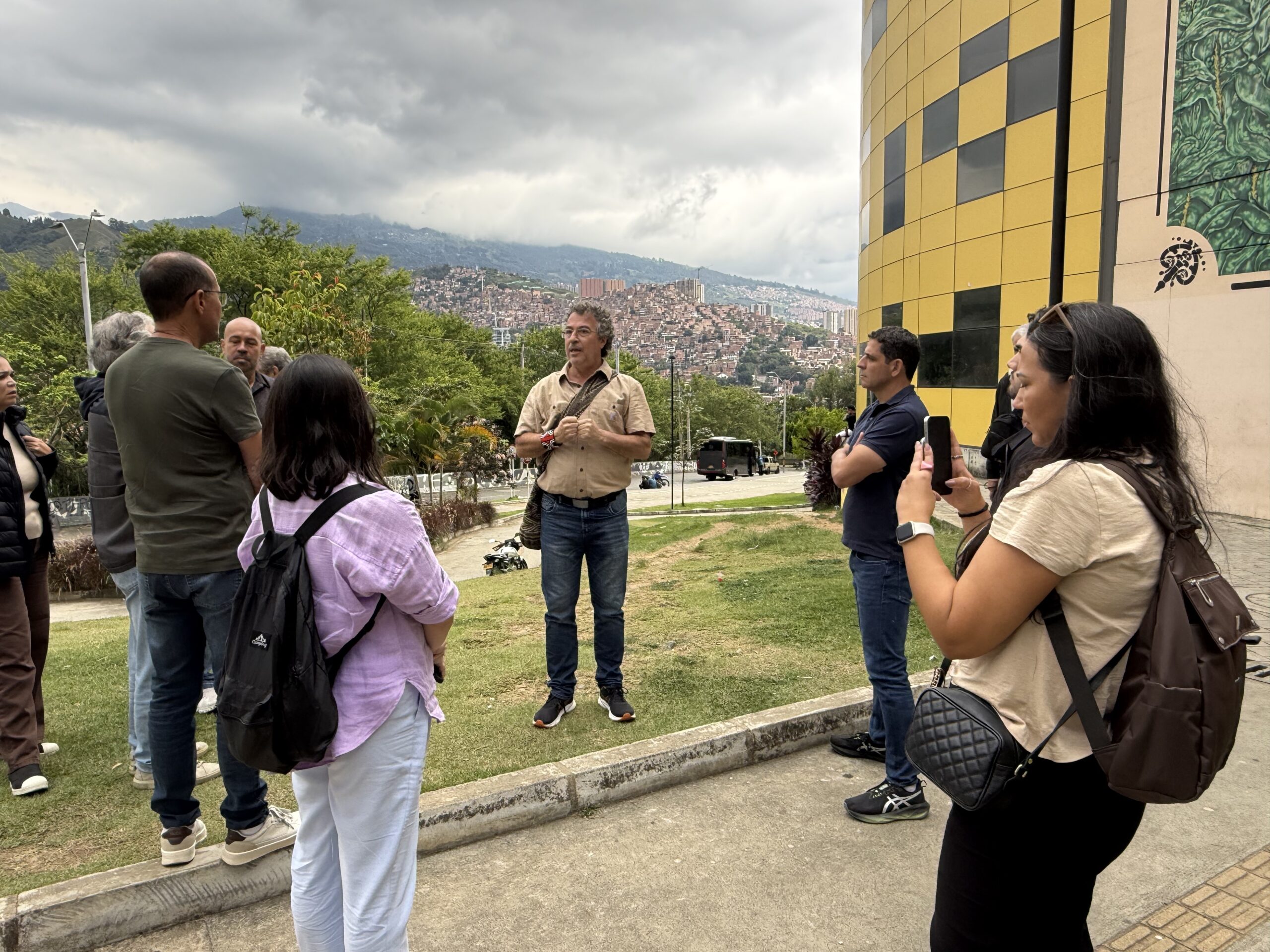 As visitas foram conduzidas por Jorge Melguizo, ex-secretário municipal de Cultura Cidadã e de Desenvolvimento Social de Medellín (2005 a 2009), um dos articuladores do modelo de urbanismo social implementado na cidade. Durante a passagem pelo parque-biblioteca, ele contextualizou as tristes histórias de conflitos e violência que marcaram a Comuna 13 ao longo das últimas décadas. Segundo Melguizo, a transformação de Medellín não se deu apenas por obras físicas, mas por um projeto social estruturado, no qual educação, cultura, participação comunitária e presença permanente do poder público passaram a orientar as intervenções urbanas.